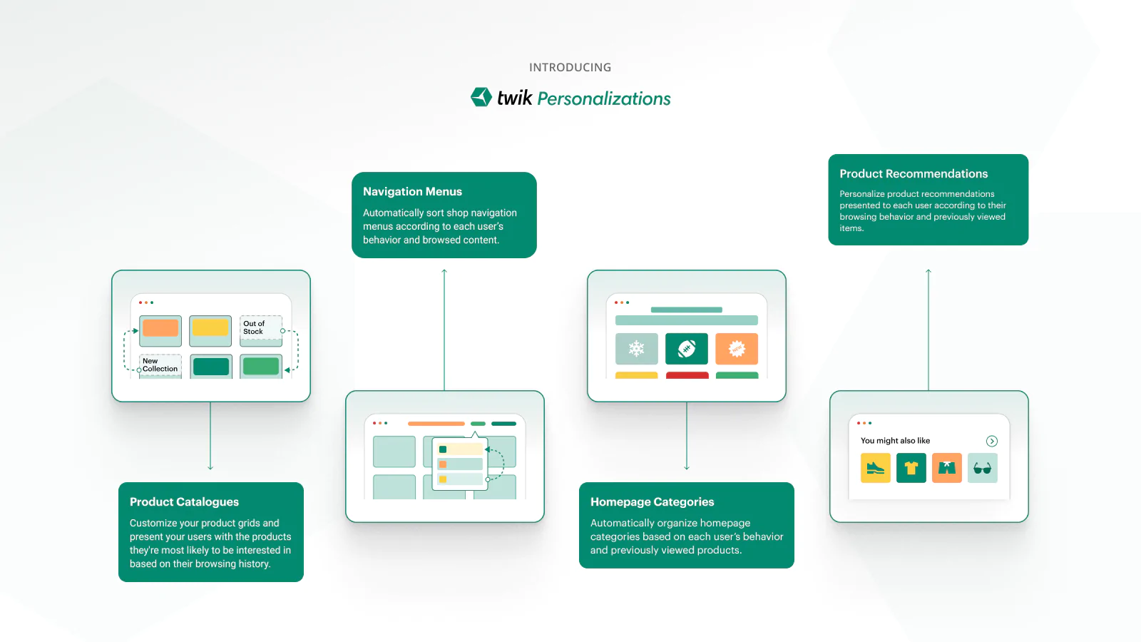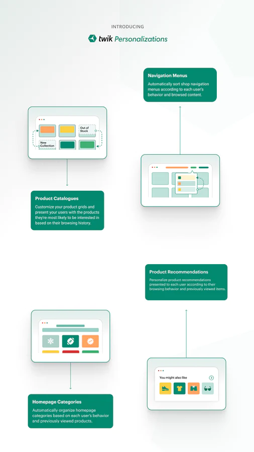 Twik is the only personalization platform, backed by 10 unique engines, that presents visitors of your shop with an automated personalization experience of product categories and navigation menus, to maximize your sales and revenue.
