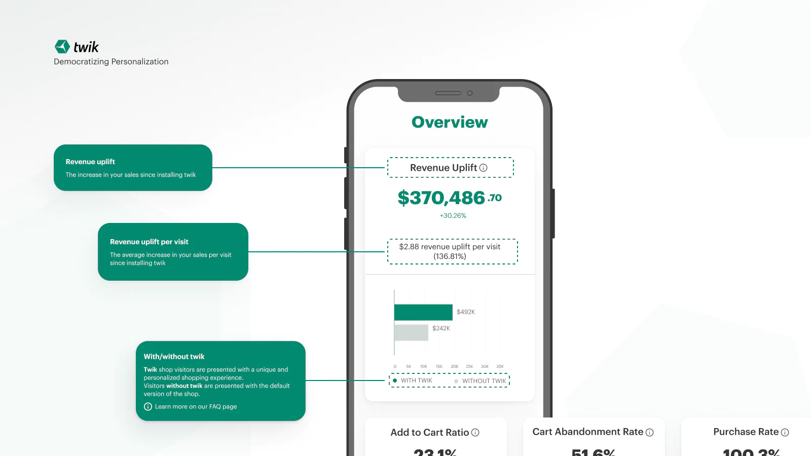 Increase Add-To-Cart : Twik increases all marketing funnel steps on your store automatically: add-to-cart, add to wishlist, newsletter submissions and leads.