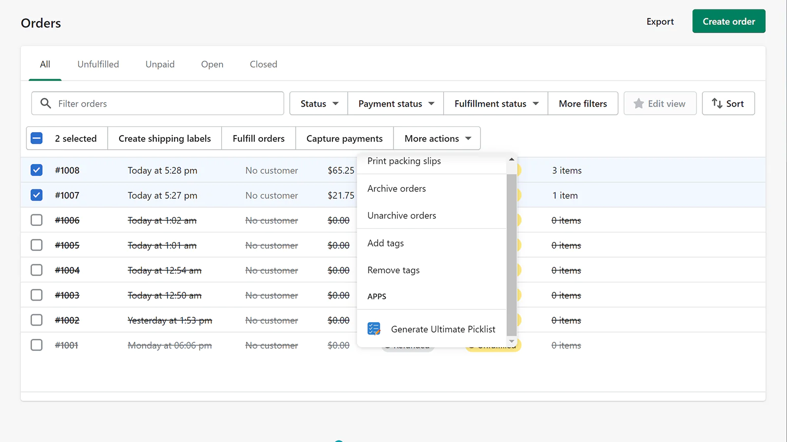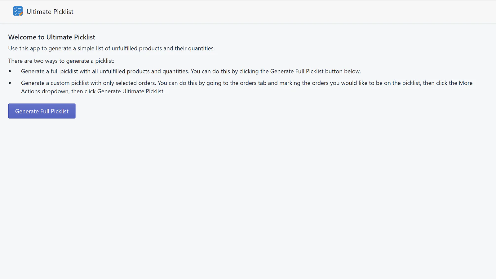 Use this app to generate a simple list of unfulfilled products and their quantities. The picklist will display rows of products and product variants, their unfulfilled quantity, and the amount remaining in inventory. You can then click "Mark Picked" to keep track of which items you have already picked during your inventory picking phase of fulfillment.