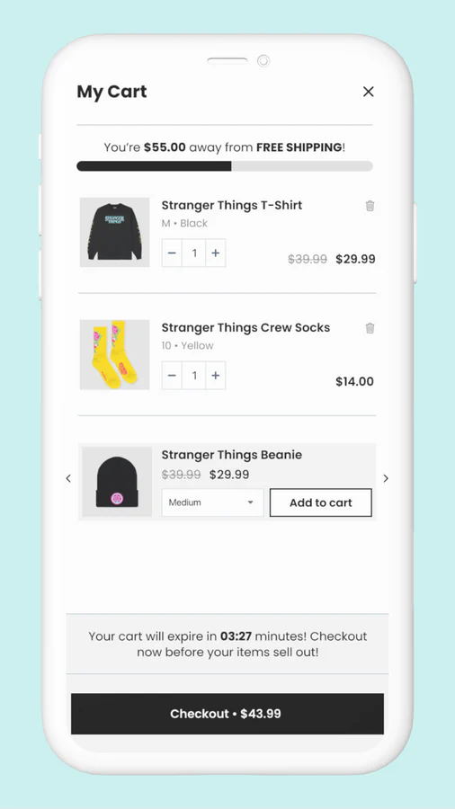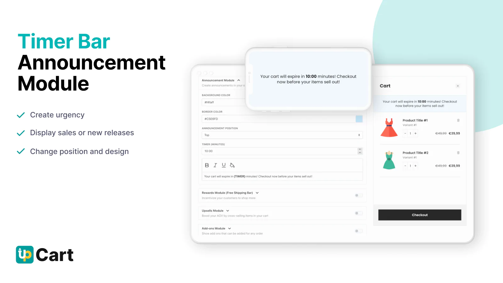 Announcements + cart timer : Create an announcement within your slide cart with a countdown timer to add urgency to the purchase or inform your merchants of new products