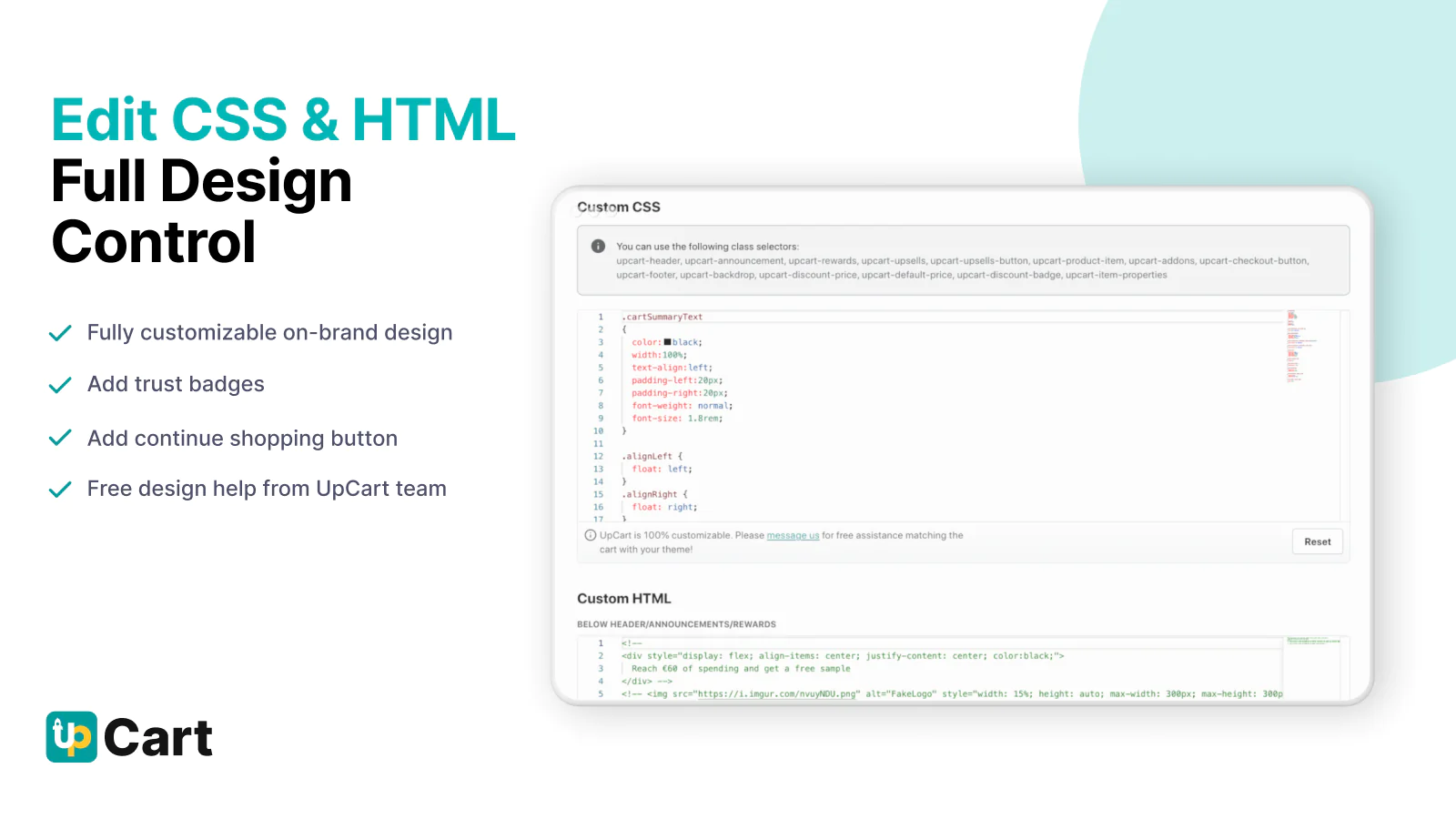 Choose the right colours, fonts, and cart designs for your brand. Take it one step further with full custom HTML and CSS control to add features like trust badges, continue shopping buttons, and much more. We have trained customer support that can help you with these custom features :)