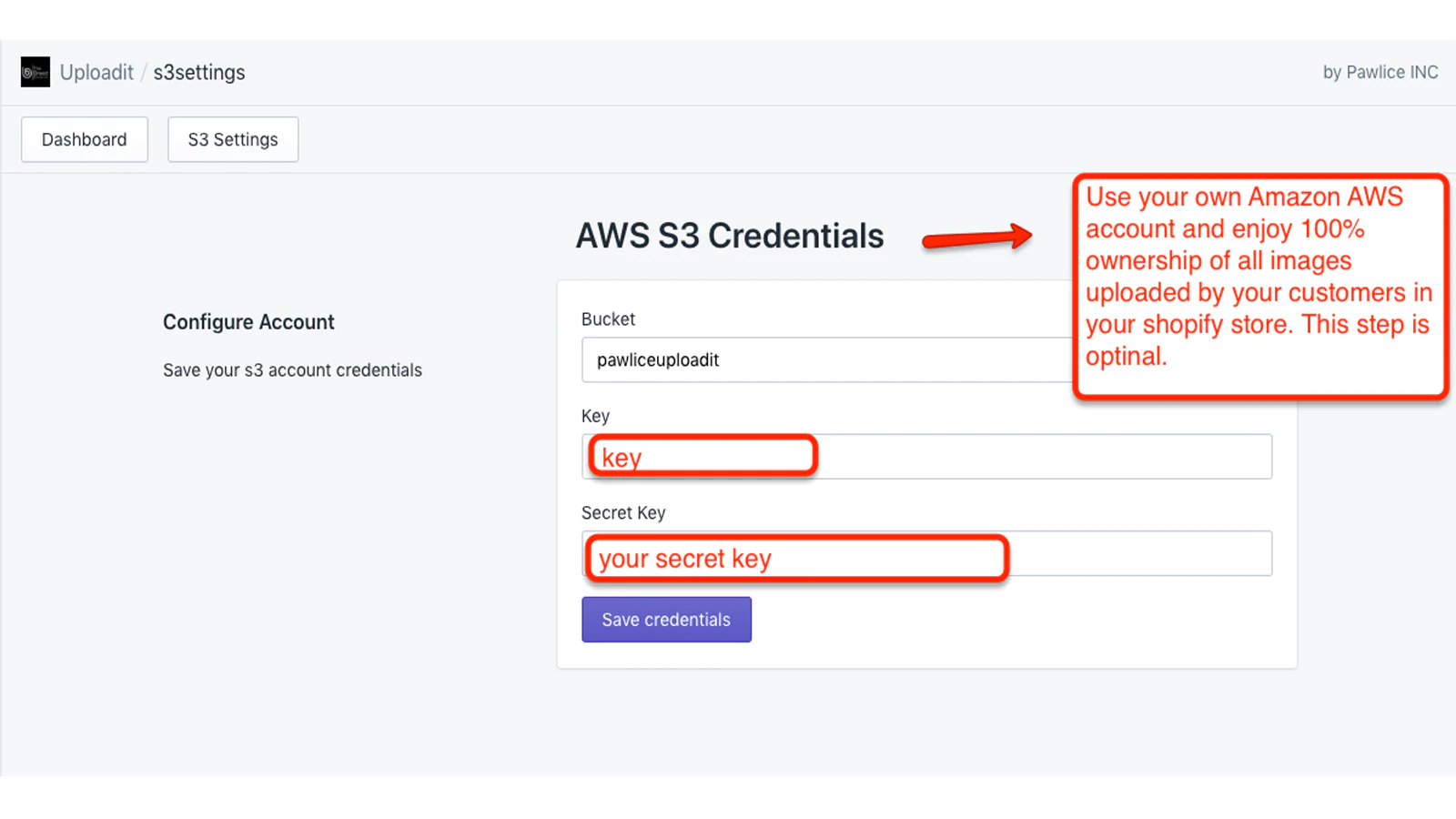 Store in your AWS account : [Optional] Use your own AWS account to upload image thus gain 100% control on every image your customer upload on your shopify store.