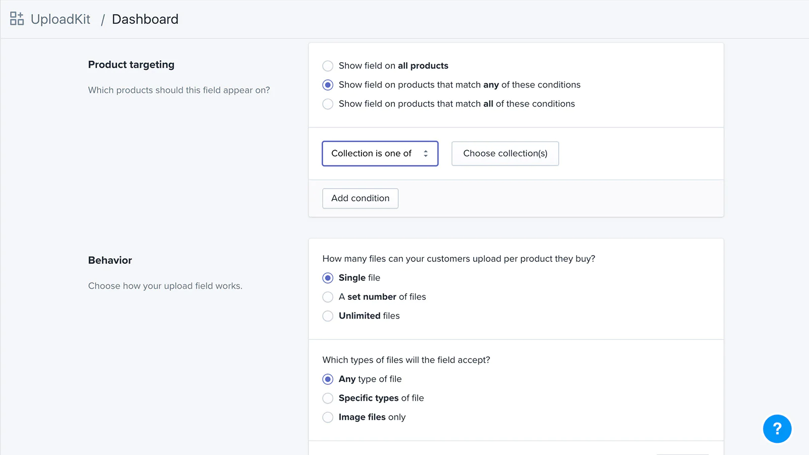 You can add unlimited numbers of upload fields, and assign them to specific products or collections, or automatically display them based on product or collection name or handle, product tag or vendor.