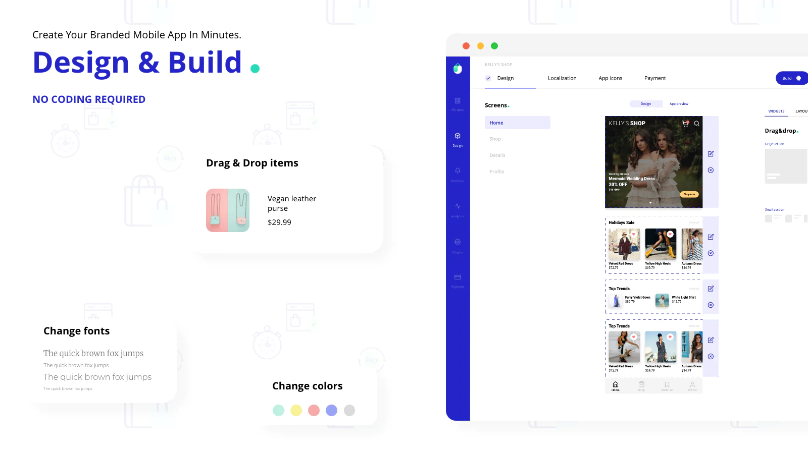 No code drag&drop builder : With our advanced and intuitive drag&drop builder you can build your mobile app in minutes. Create a perfect mobile app for your brand.