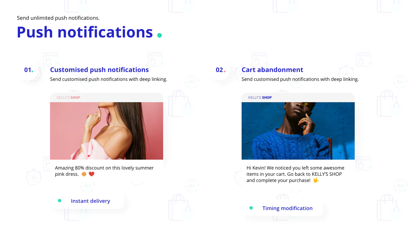Unlimited push notifications : Get your message across and engage your shoppers as efficiently as with SMS marketing, but with 0 costs.