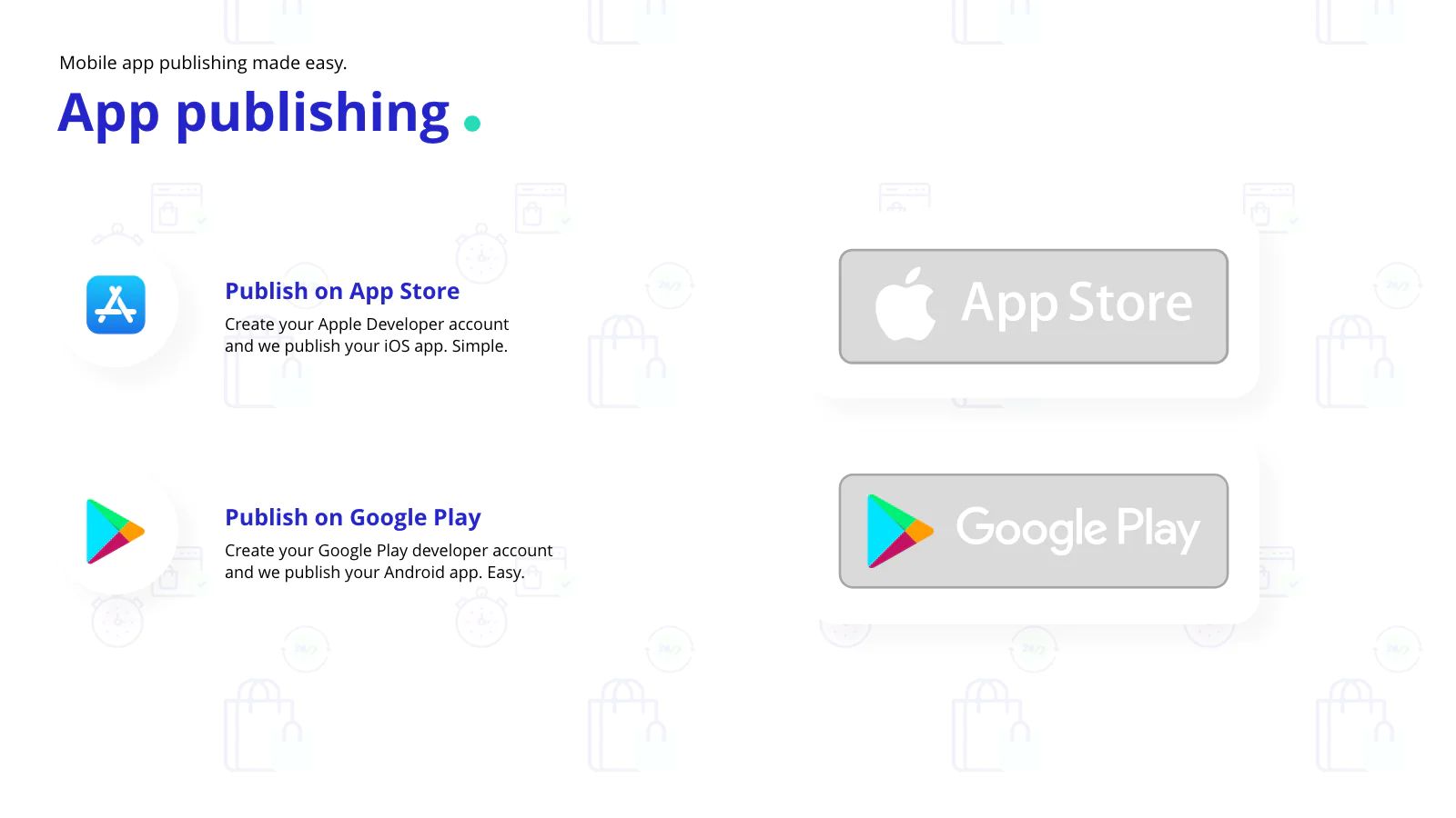 Publish your app with ease : Publish your iOS and Android app in minutes. Create your AppStore and Google Play Store developer accounts and we publish the apps for you.