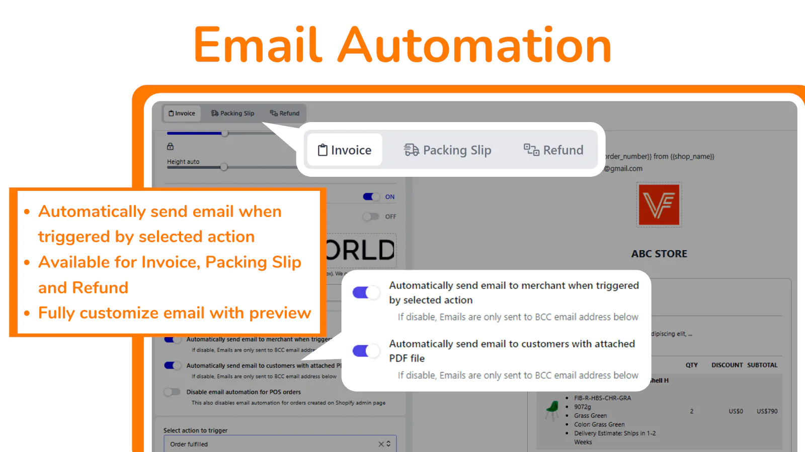 Email Automation : Attach PDF invoice, packing slip, refund to automation email, when orders are created, refunded, or when shipments are made.