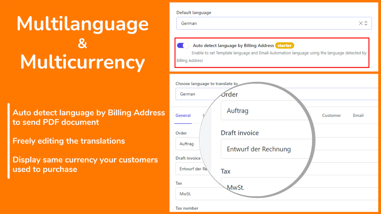 By default, invoices are in English, but merchants can choose a different language to display them in, and translate all to that specific language if needed.