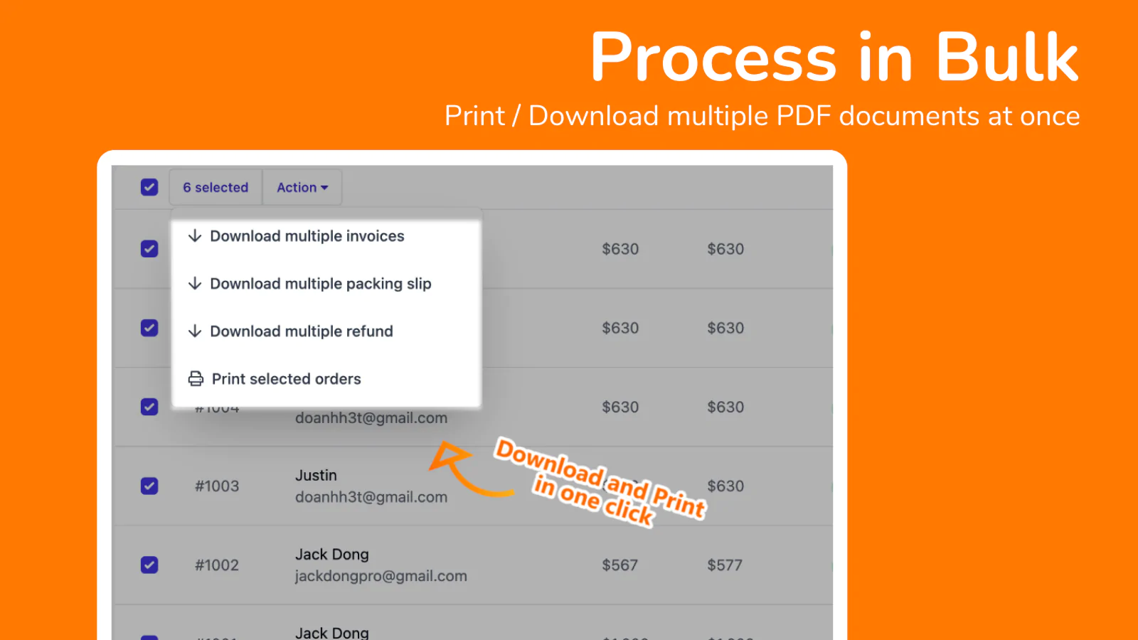 The app displays all Shopify orders, with all invoices for orders, shipments, and refunds. Merchants can either work with them individually or in bulk.
