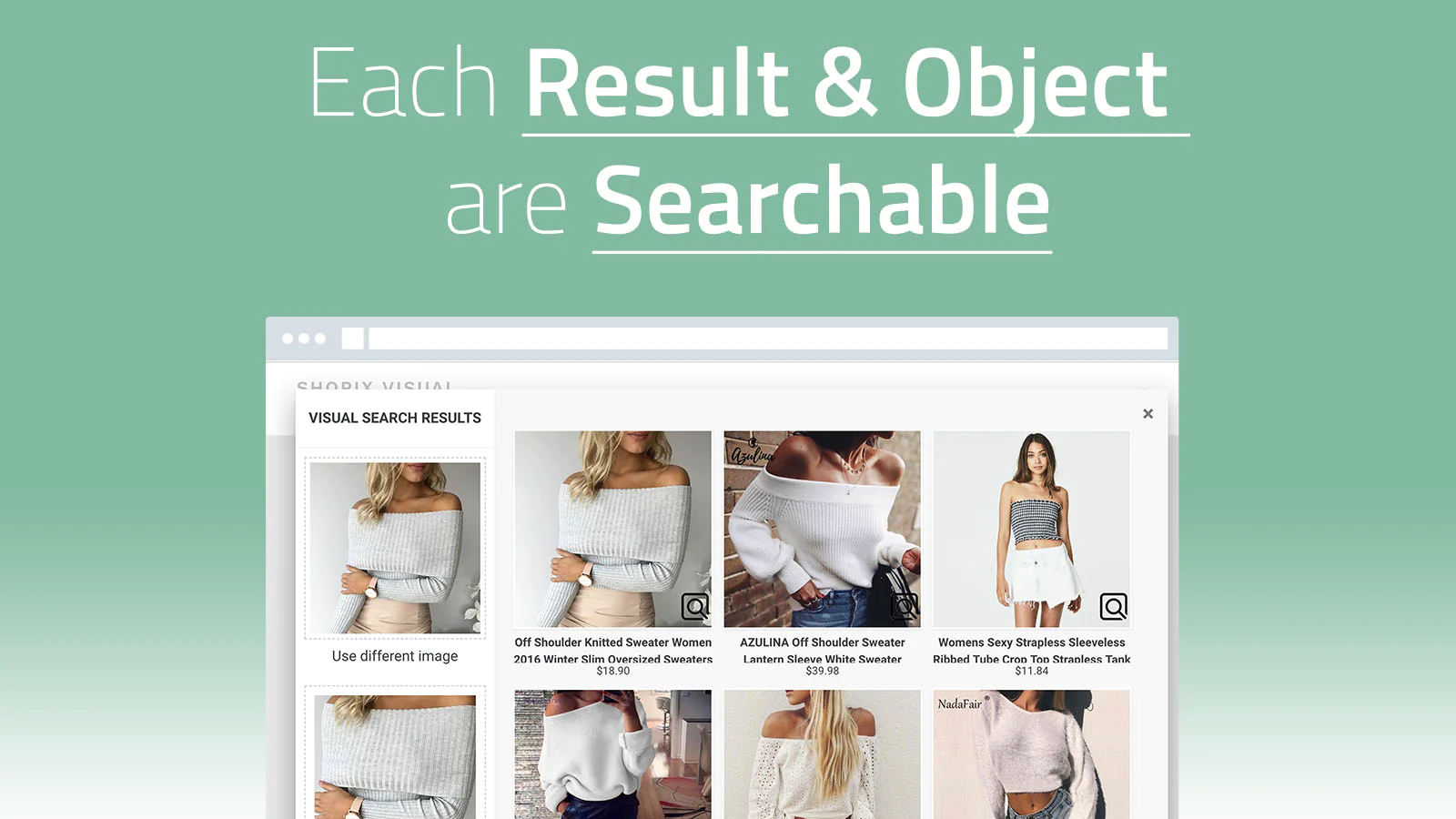 Writing is a hard, time consuming task, Visual search is a more natural way to discover products on your store, using AI to reverse image search. your website visitors can upload an image that inspires them (from social feeds, styling articles or IRL street inspiration) and get visually similar items from your catalog of products. Basically its Shazam for shopping