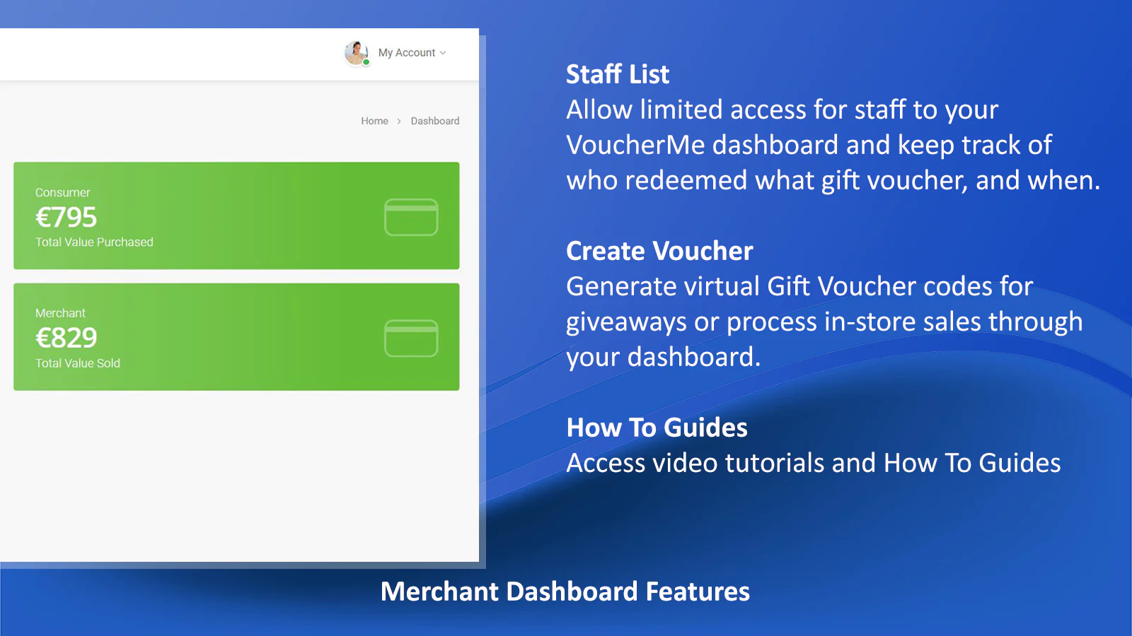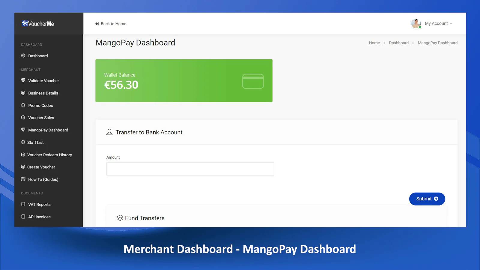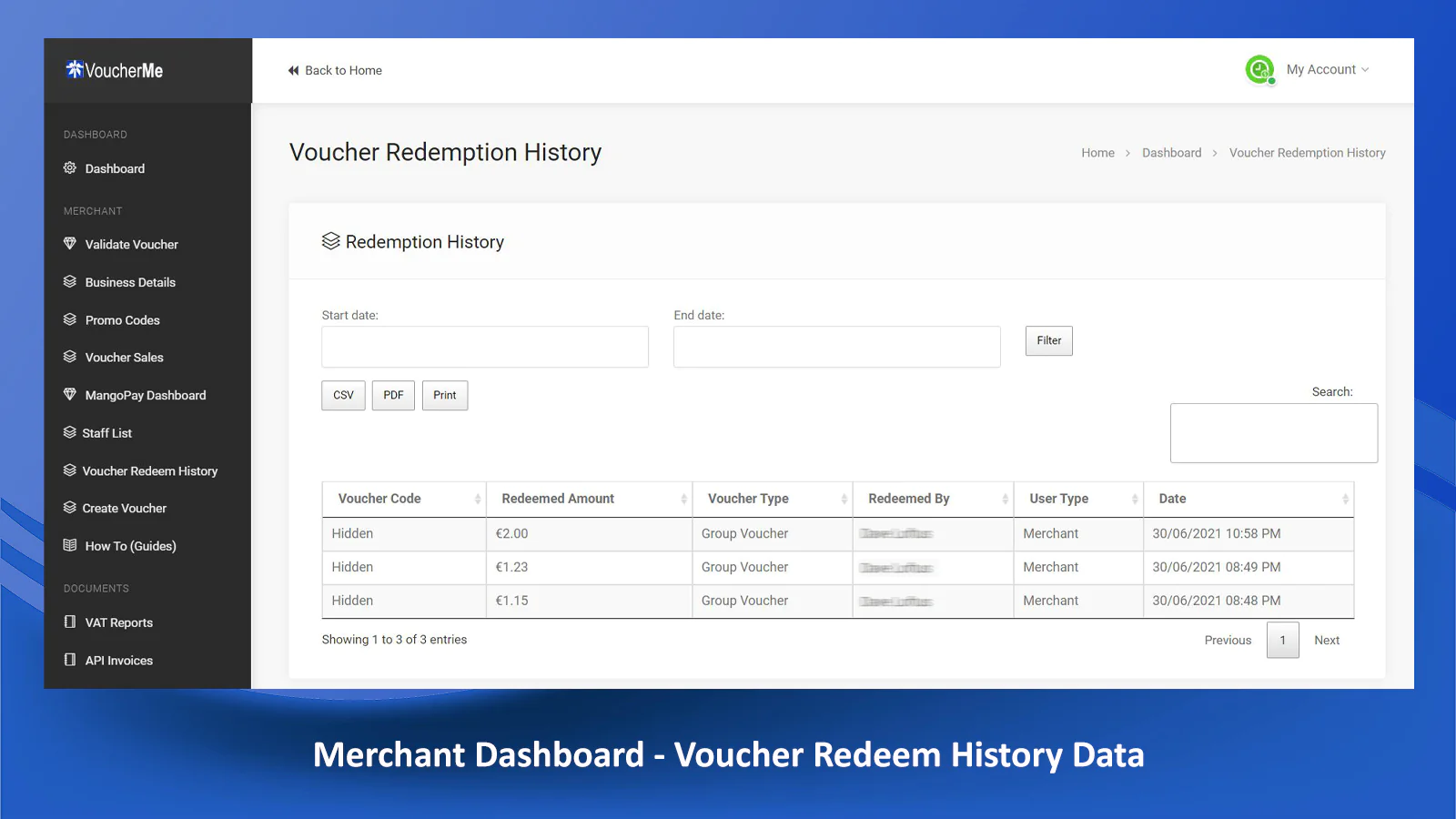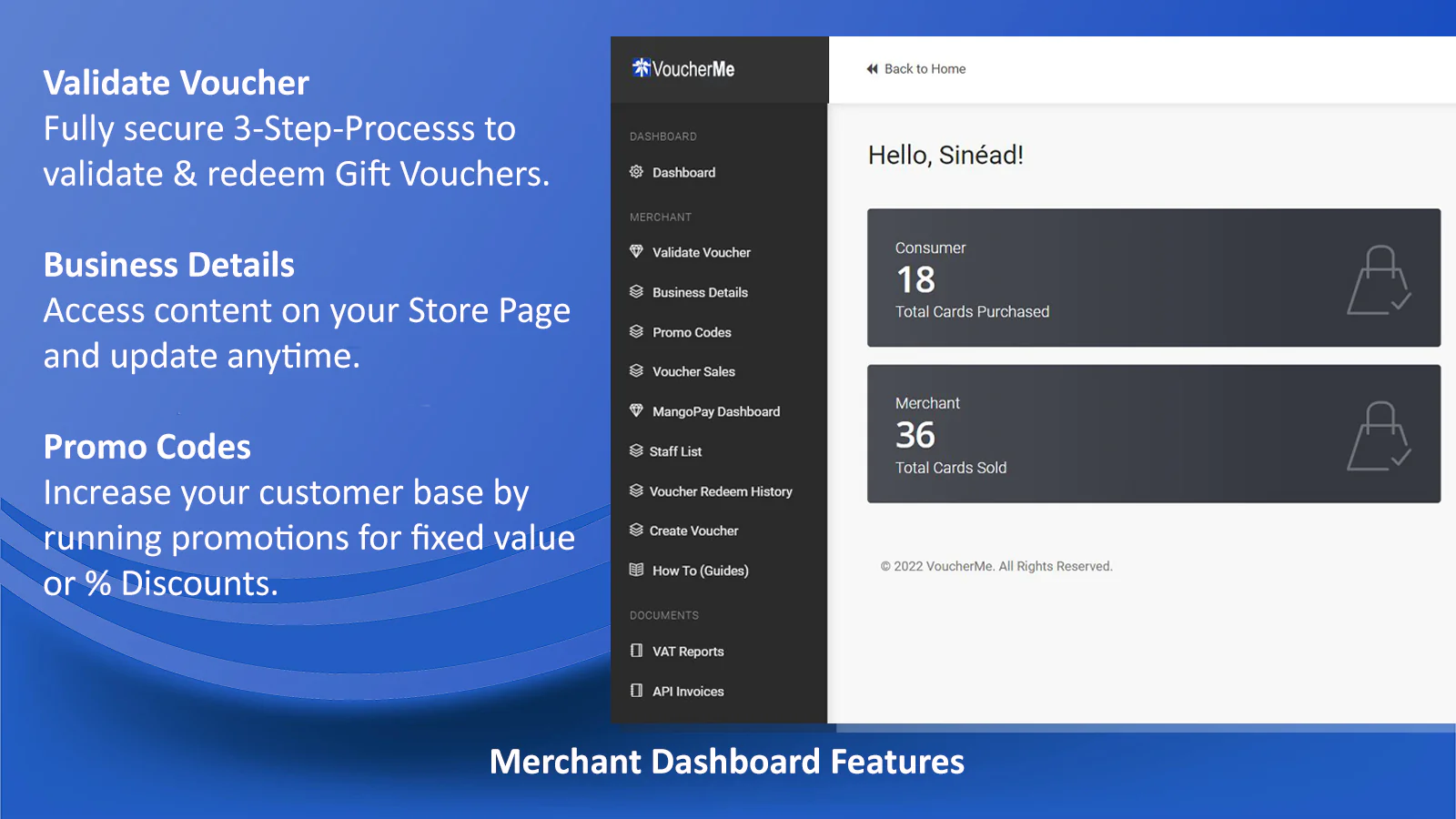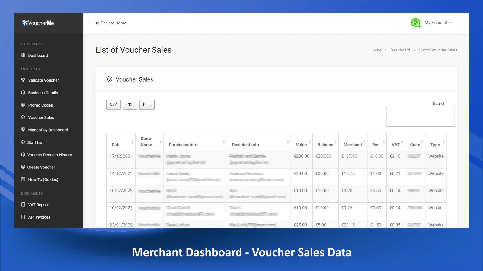From your VoucherMe dashboard you have instant access to your gift voucher funds through your MangoPay eWallet. Your funds are held securely in your eWallet and you have complete control of when and how much you want to draw down to your linked bank account. You also have access to all your reporting needs, such as Voucher Sales, Voucher Redeem History & Vat Reports.