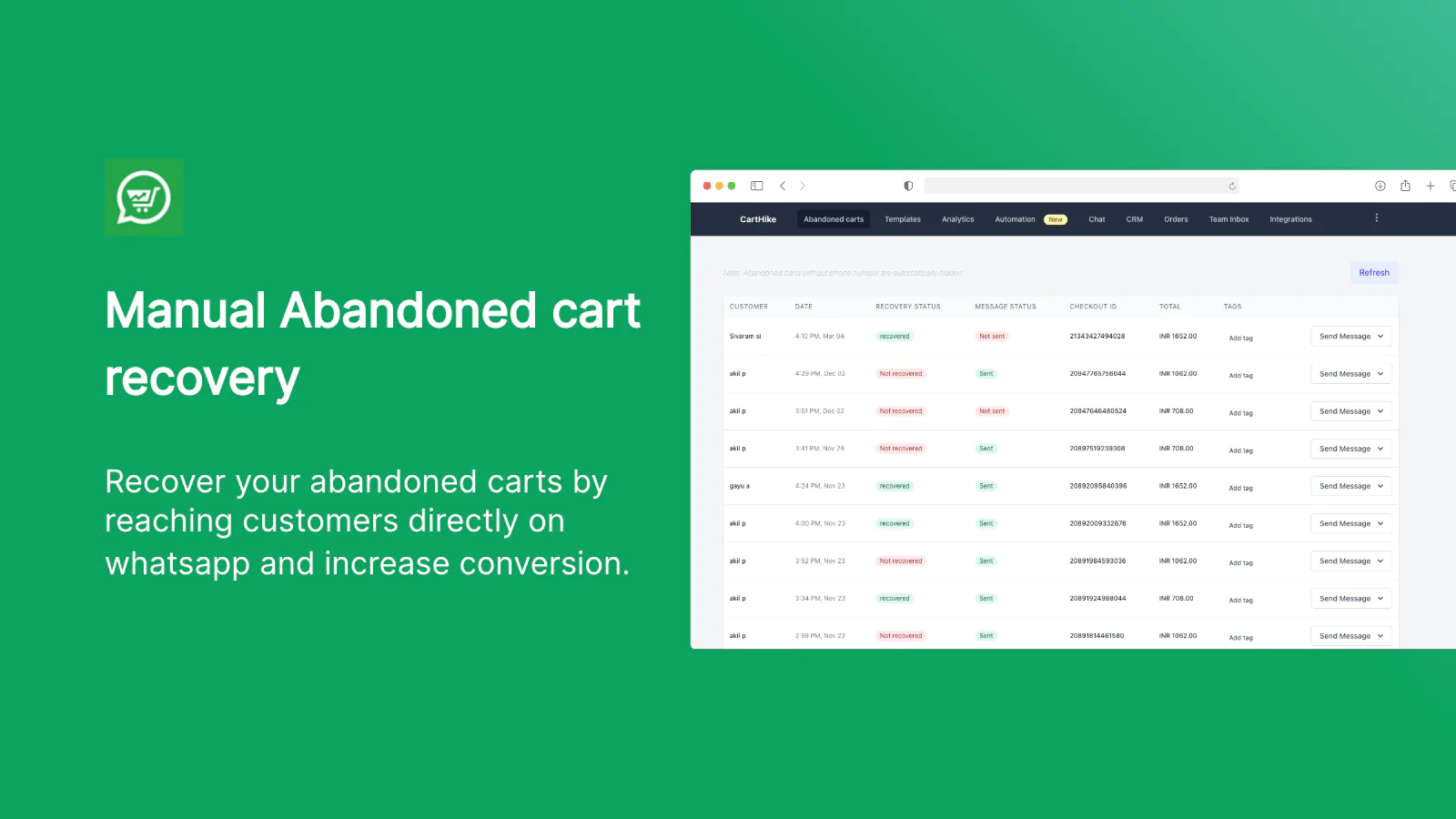 Abandoned cart recovery : Recover abandoned carts automatically using WhatsApp we have recovered over 6.6 million USD for our customers so far.