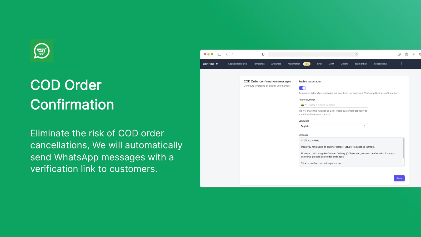 Eliminate the risk of COD order cancellations, We will automatically send WhatsApp messages with a verification link to customers.