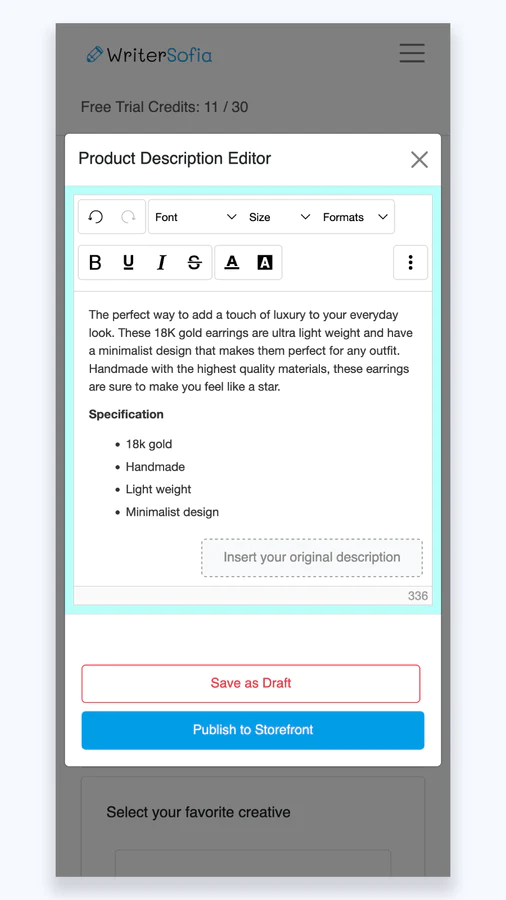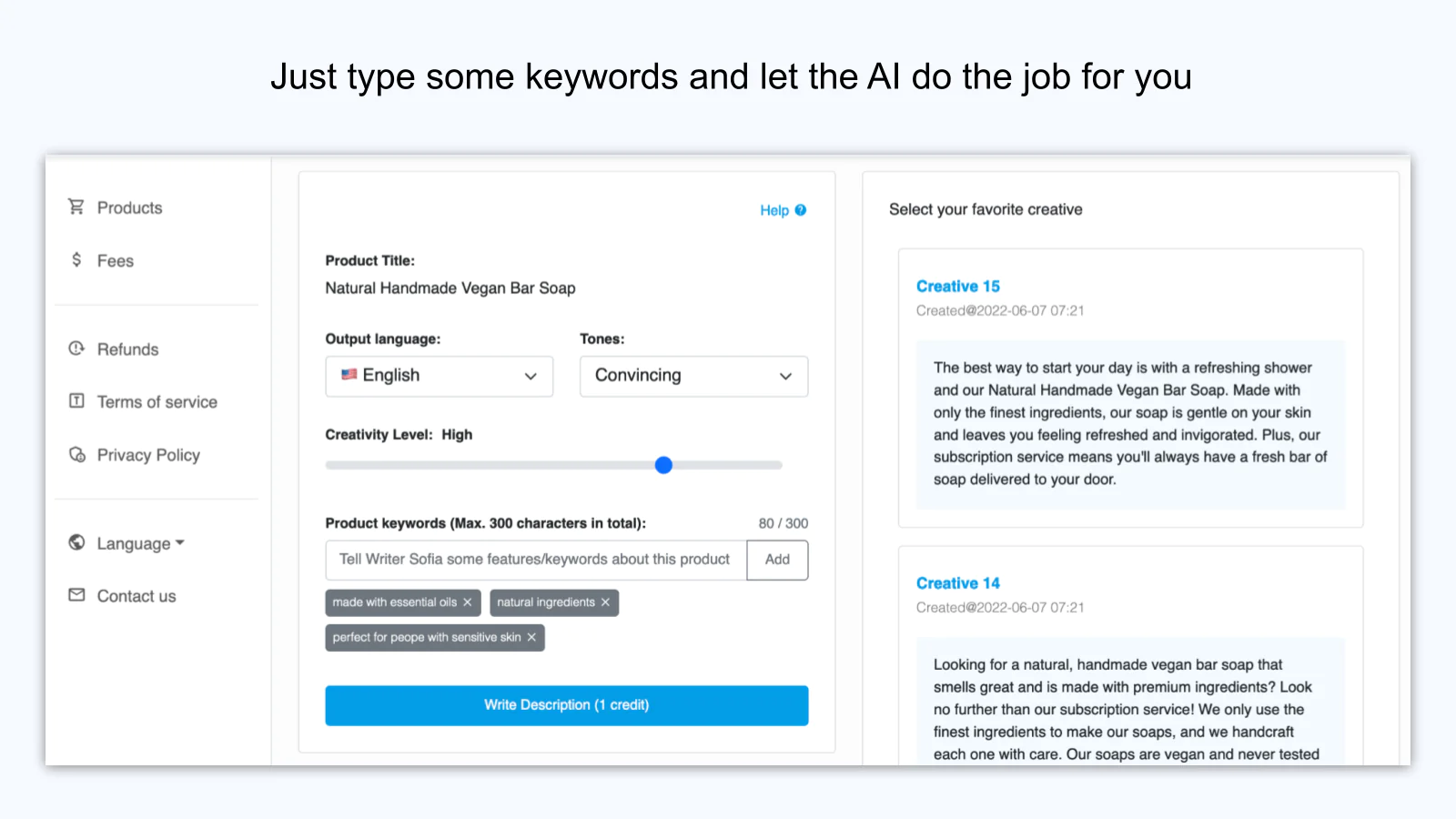 You are able to change the AI's creativity level and tone style that tailor to your products. This allows you to get the most accurate and relevant information about your products without having to worry about the generated description being too generic or too specific. You can also use it to create multiple versions of a description, each with a different level of creativity or tone, to see which is most effective.