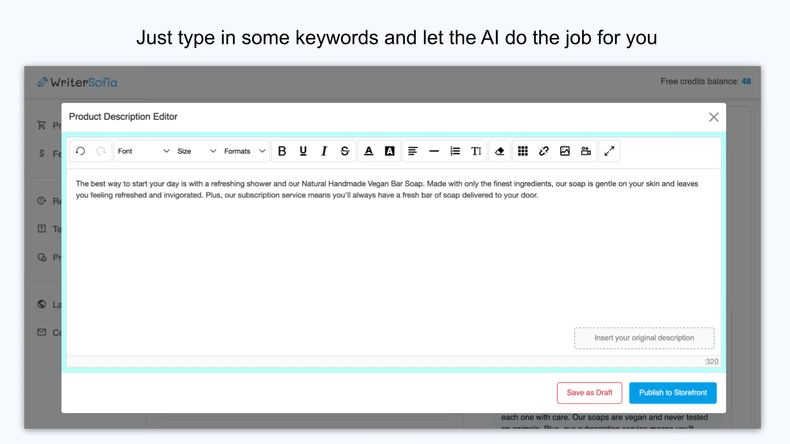 Writing product descriptions can be exhausting and time consuming. Tell Writer Sofia about the keywords and then watch the AI write paragraphs in seconds.
