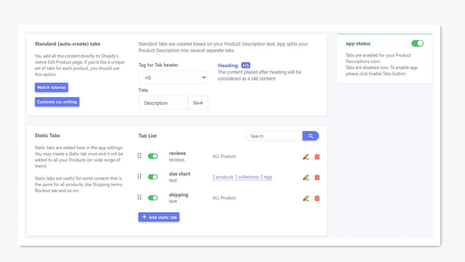 Flexible tabs management : No need to add a tab to each product. Apply tabs to collections or product or tag for the ultimate time saver.