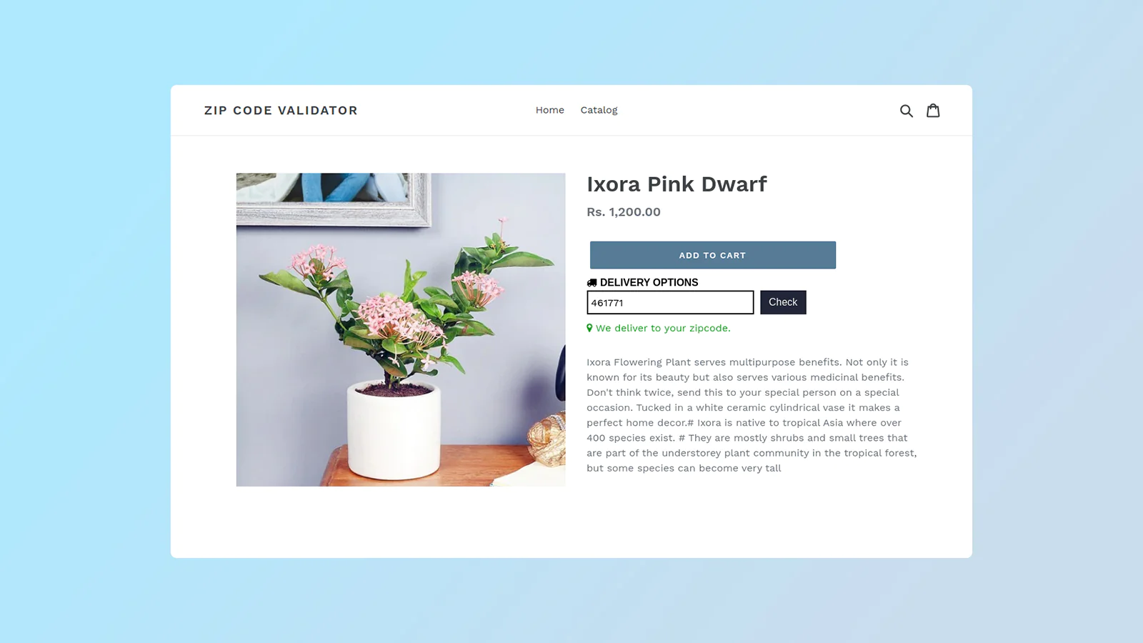Zip code validator is a tool that is designed to add a zip code availability. Customers can enter their area zip code and check if that product is available at their location or not. Store themes do not pre-include this feature. When a customer found that a specific product is not available at their locality, this can lead to a loss of customers from your store So zip code validator is this tool to help you out.