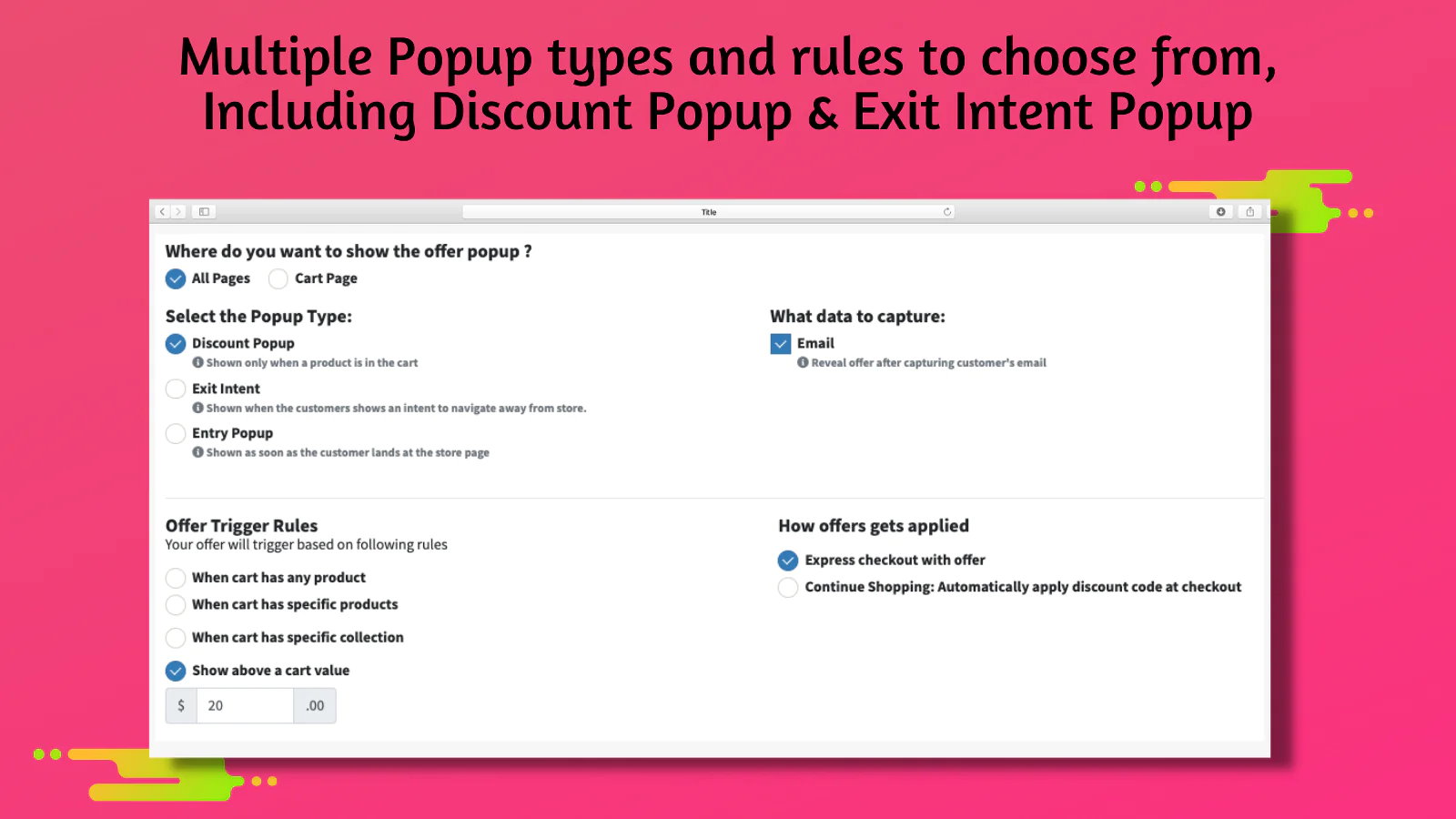 Automatic Discounts : Offer exclusive coupons, discount codes, countdown pop ups & promo codes to customers and recover cart abandonments.
