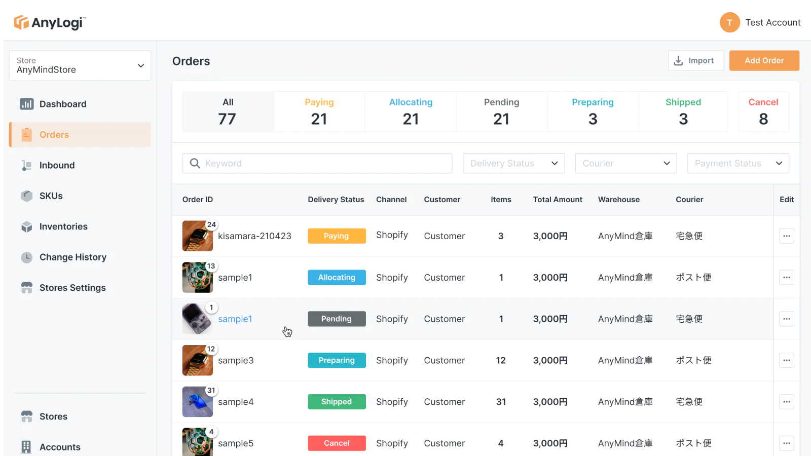 Simpler Logistics : Simply install the app and utilize AnyLogi's partner warehouses ・ Real-time status updates ・ Automatic import of order information