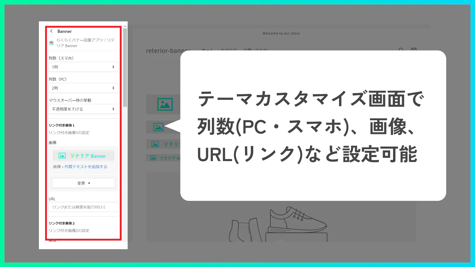 らくらくバナー設置アプリ|リテリア Bannerは、画像とURLを設定することでリンク付き画像を実装出来ます。さらに、横並びの数をPC・スマホで別々にすることでストアに合うデザインに設定できます。