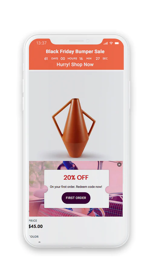Promote offers with banners : • Free-Shipping Bar • Quick Announcement Bar • Countdown Timer Bar • Email Collection Bar