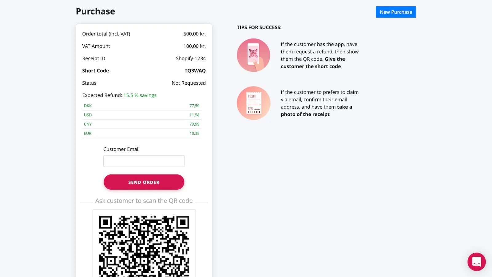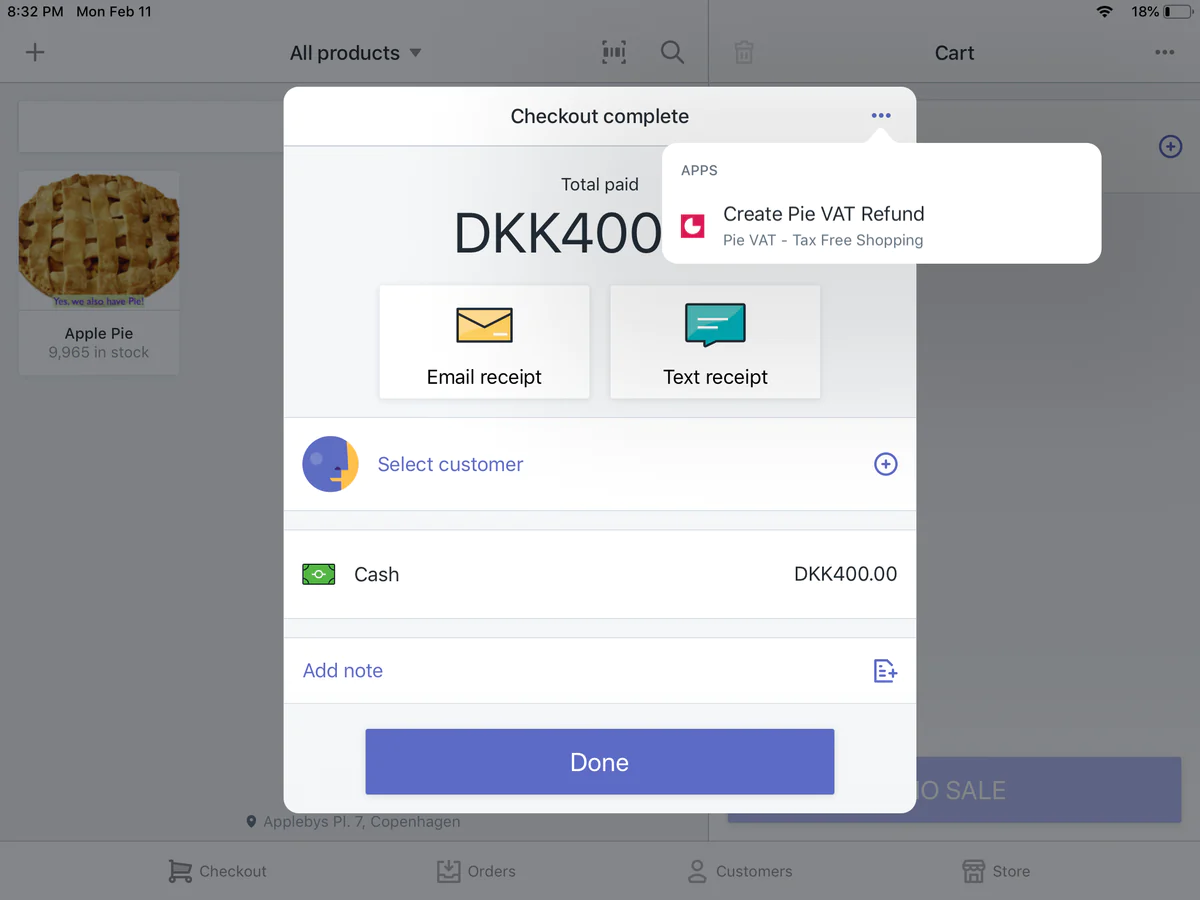 For merchants, the our Shopify app extends Pie's native capabilities into an easy to use extension. After a tourist places an order and asks for a VAT refund, simply tap on the Pie VAT app, and a Pie refund will be generated automatically with all of the purchase information pre-populated. Ask the tourist to download the Pie VAT app and scan the shown QR code, or ask for their email and send them a Claim email. That's it!