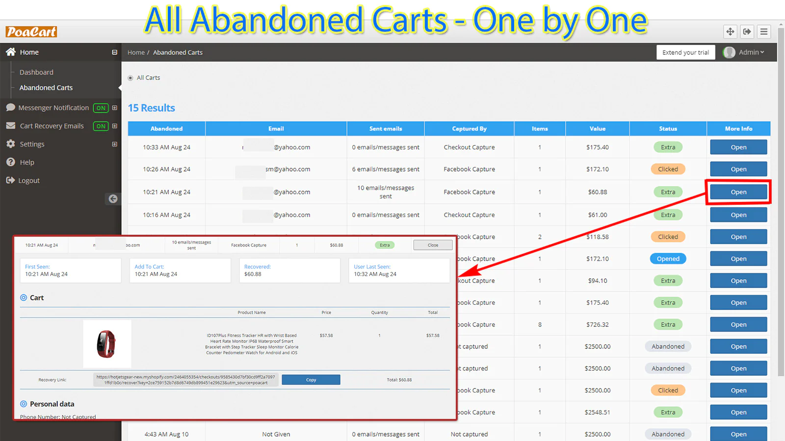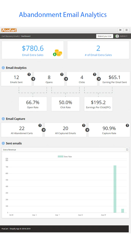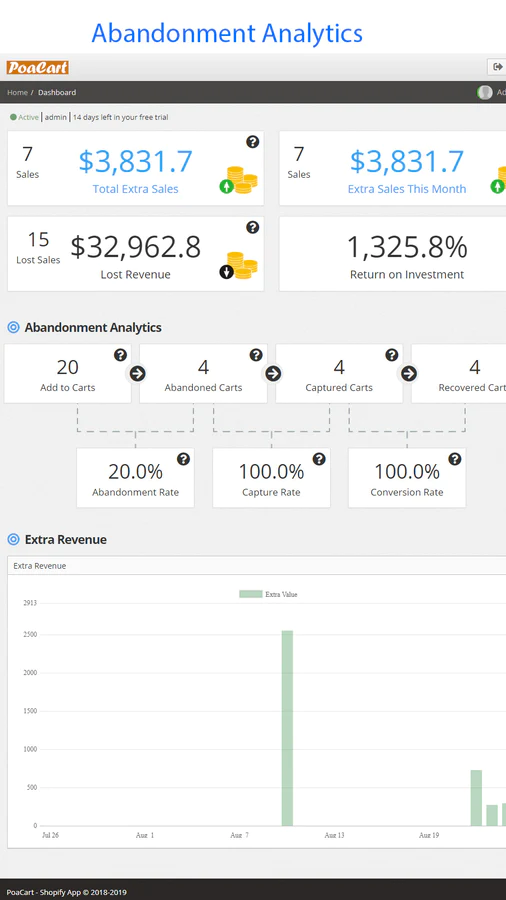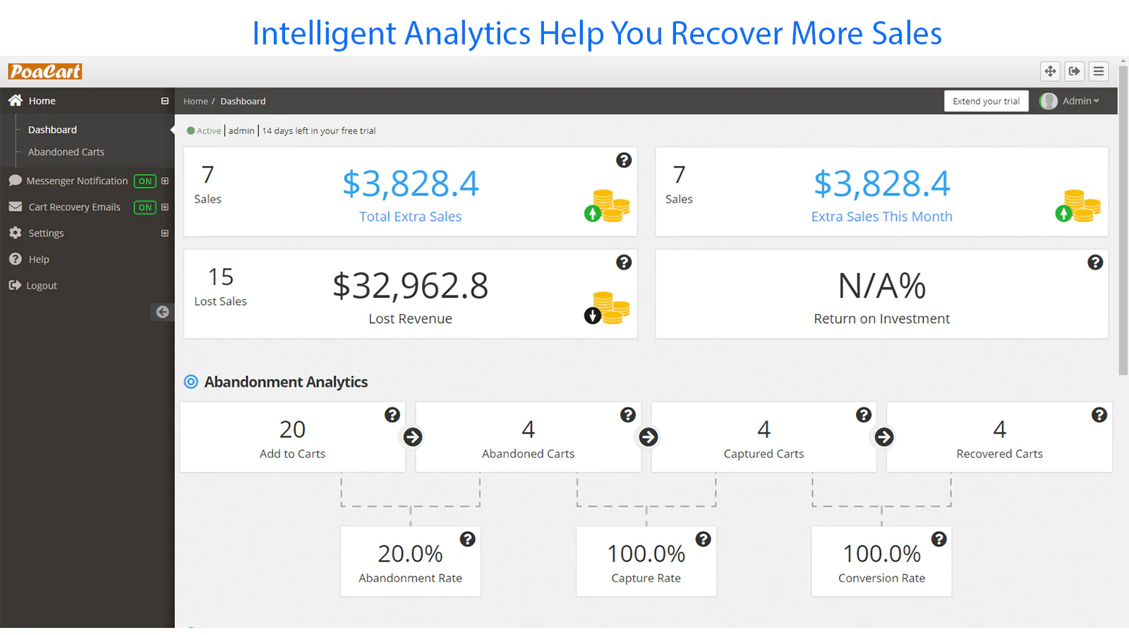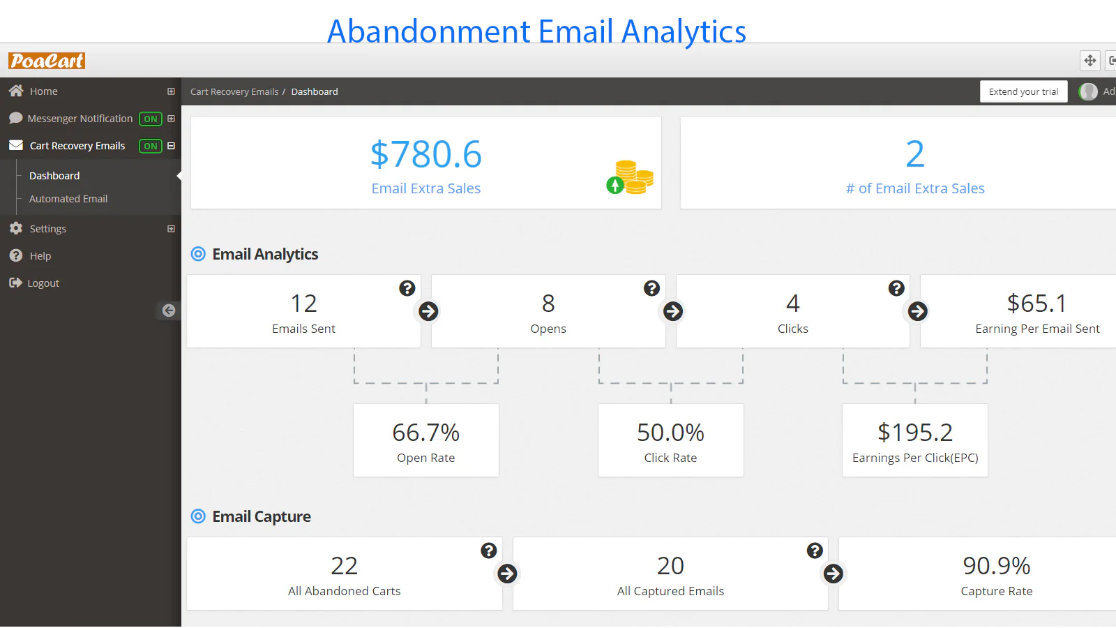 PoaCart’s real-time dashboard shows you how much money you are losing through cart abandonment. It tracks all the important metrics to help you recover more abandoned sales.