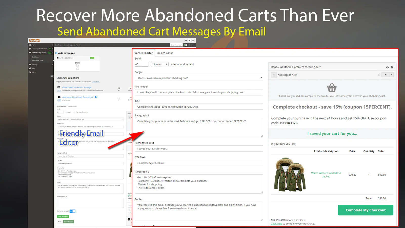 To reach most cart abandoners, PoaCart combines Facebook Messenger and abandoned cart emails to convert most abandoned carts into sales.