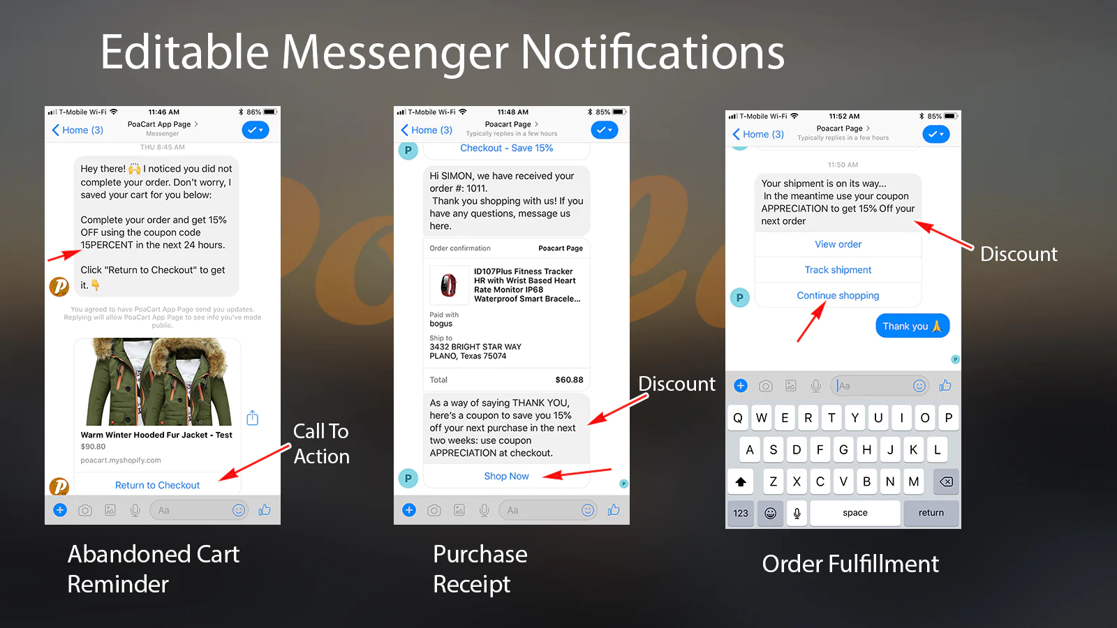 PoaCart sends abandoned cart messages, order receipt and fulfillment notification by Messenger. Each message also offers your buyers discounts so they can buy more from you.