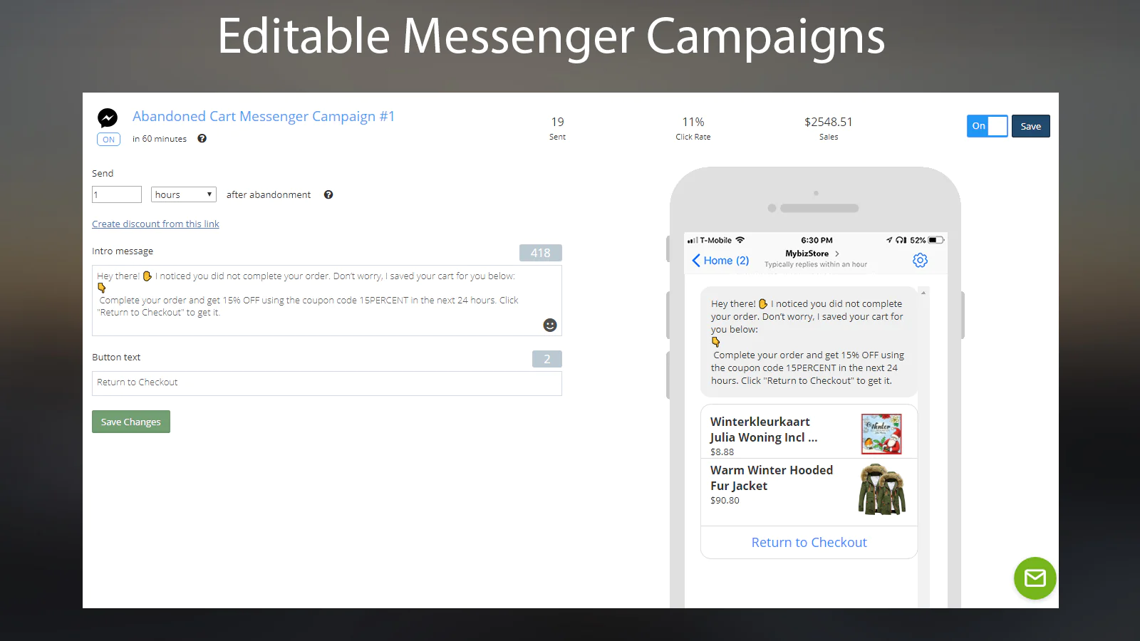 Cart abandoners will get Messenger notifications on their phone when they receive the cart recovery messages, increasing message delivery and response. No spam folder!
