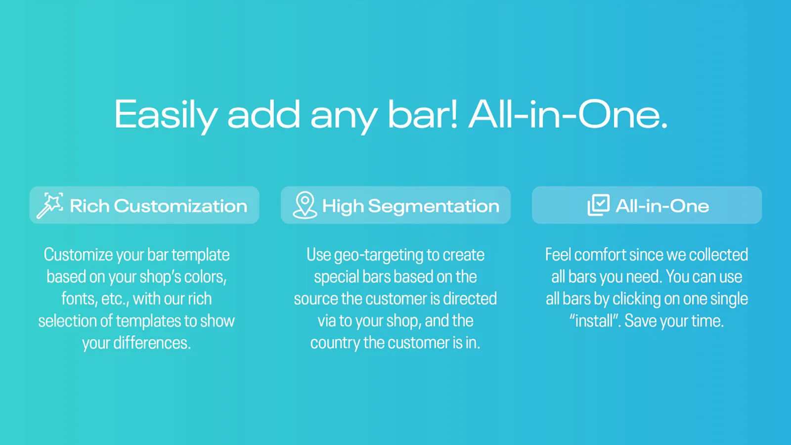 Our segmentation is great! You can change the bars based on the county, the source, and even the time spend on your shop’s site! With the use of every bar included in our app, you may upsell without much effort. All of these are included in one single app.