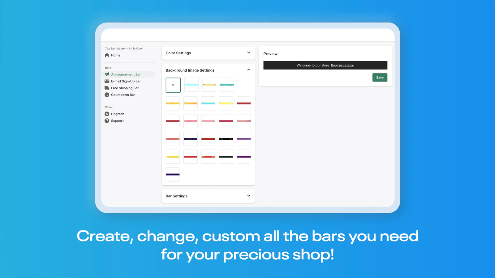 Increasing your sales by increasing your site’s conversion rate is in one with the easy use of Countdown Bar, Announcement Bar, Multi Announcement Bar, Free Shipping Bar, and an E-mail Sign Up Bar.