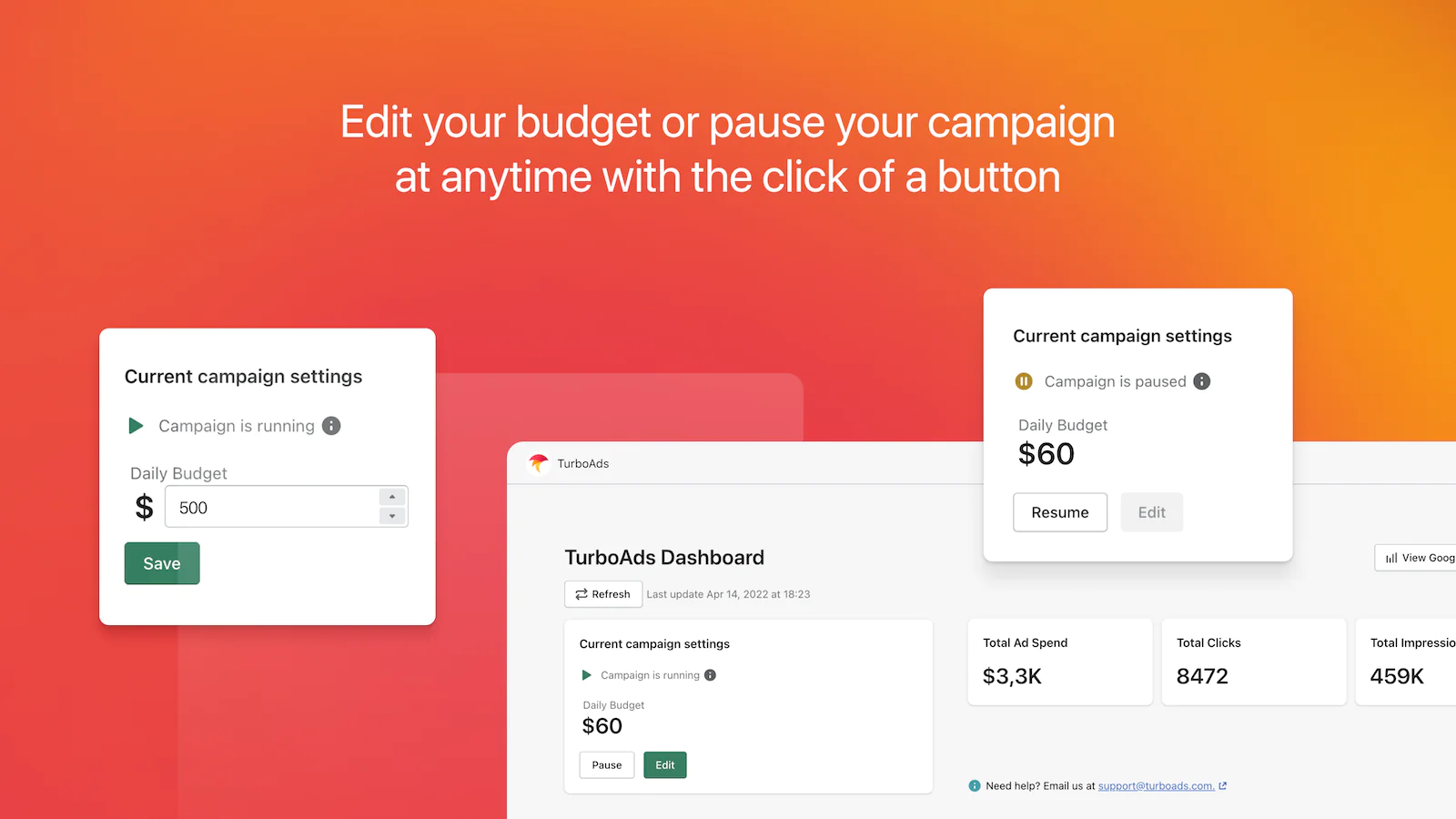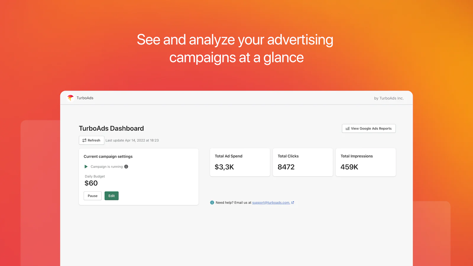 TurboAds AI analyzes your store, including your products, your current customers, and benchmarks, and generates the most suitable marketing campaigns to maximize your roas. Once your Google Ads have been created and launched, TurboAds will keep optimizing your campaigns and maximizing your profits. Worry not, you'll always be able to look at the Google Analytics and check your actual spending. Moreover, if you feel we're doing great you can increase your daily budget in a couple of clicks! If you feel the strategic need of stopping the campaigns or you're not happy with the results, you can pause TurboAds with just a single click. Let's start our journey to success!