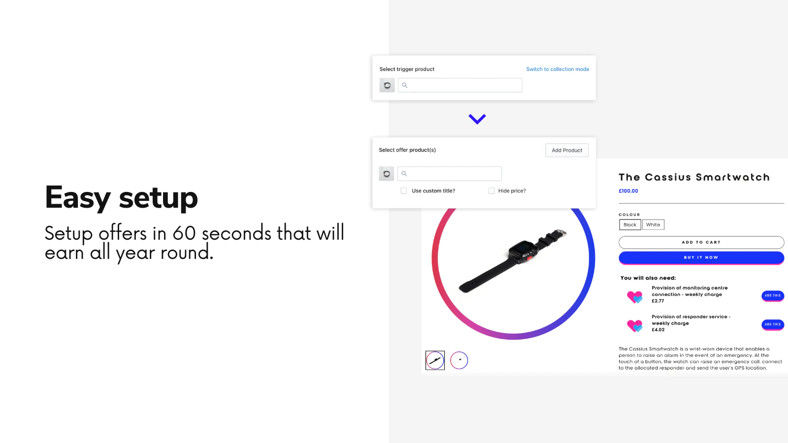 Sell more from product pages : Create upsells that make sense by offering upsells, cross-sells, recommendations, add on’s and one click offers. The ultimate upsell engine!